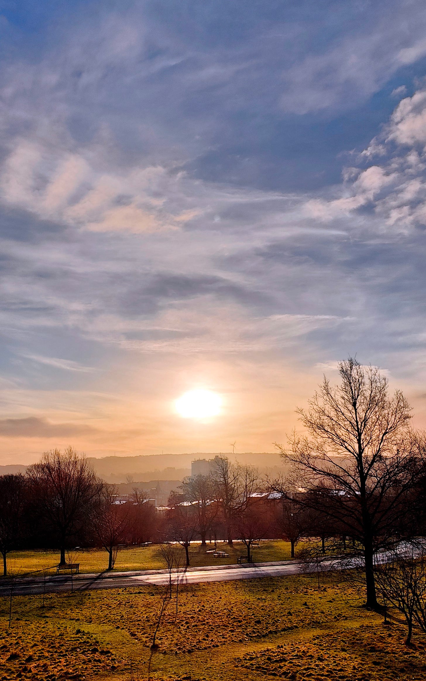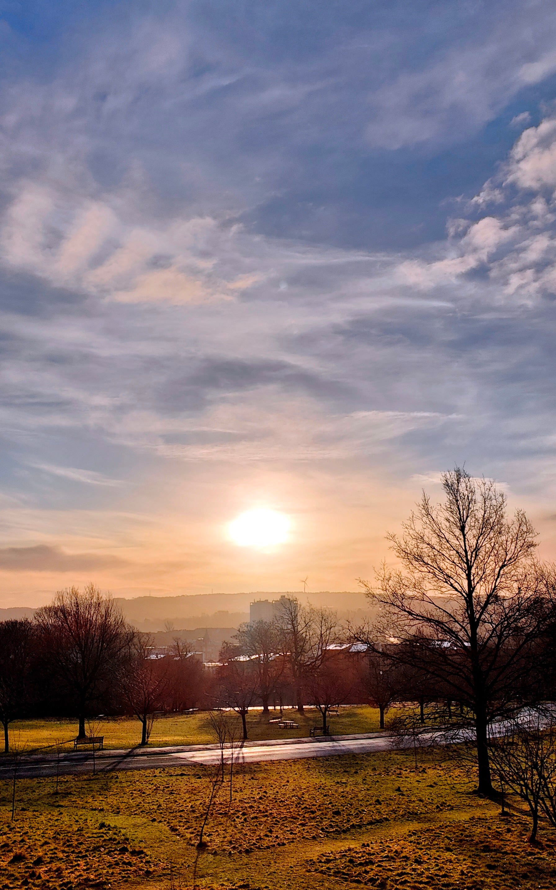 There are people gathered at the flagpole when I get there. It’s one of the city’s highest points with open views north towards the Campsie Fells, Dumgoyne and Ben Lomond. It’s not unusual for people to punctuate their walk by stopping at the flagpole and I do just that, often multiple times in a day. Today’s visitors resemble a congregation. They stand alone or in pairs or in clutches and all of them face the same direction. I join them and try to summon the memory of the last time I saw the sun so bright in a clear sky, which was maybe on the beach on Christmas Eve. The sun then felt significant for very different reasons and I wonder whether what I’m brooding over now would feel easier if the sun really was a god, the flagpole an altar and me a believer.