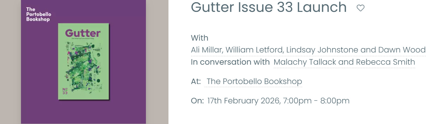Join me, Ali Millar , William Letford and Dawn Wood to celebrate the launch of issue 33 of Gutter Magazine , Scotland’s leading literary publication, this Tuesday 17th Feb at 7pm UK time in person at Portobello Books in Edinburgh, or online. All ticket details here.